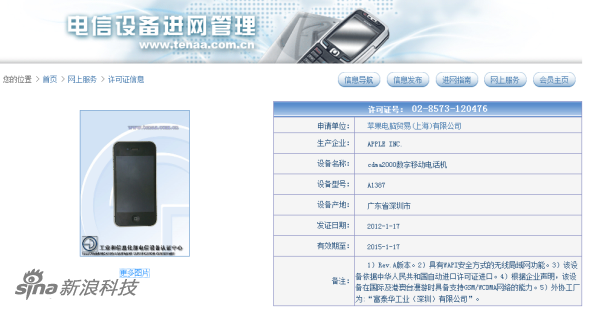 根據(jù)工信部電信設(shè)備認(rèn)證中心網(wǎng)站資料顯示,CDMA版iPhone 4S的入網(wǎng)許可證號為02-8573-120476,發(fā)證日期是1月17日,有效期至2015年1月17日,申請單位為蘋果電腦貿(mào)易(上海)有限公司。