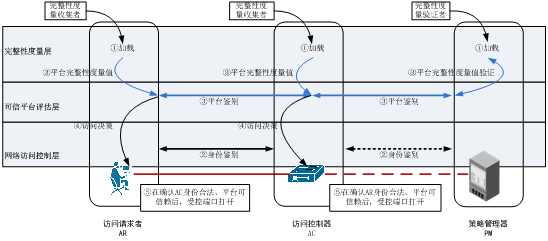 其身份鑒別可提供對(duì)身份合法性的驗(yàn)證,其平臺(tái)鑒別可提供對(duì)平臺(tái)安全狀態(tài)的評(píng)估,包括對(duì)平臺(tái)中各個(gè)組件的完整性、運(yùn)行狀態(tài)、端口狀態(tài)、補(bǔ)丁狀態(tài)等的評(píng)估,可確保網(wǎng)絡(luò)連接兩端設(shè)備的平臺(tái)是可信賴的。