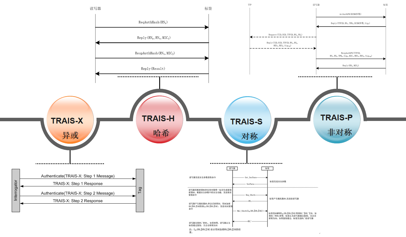 西電捷通TRAIS安全研究團(tuán)隊(duì)首席技術(shù)官表示:“TRAIS方案包括針對(duì)各種等級(jí)的鑒別與保護(hù)協(xié)議,以及訪問(wèn)控制協(xié)議等,提供實(shí)體鑒別、保密通信、訪問(wèn)控制等空中接口鑒別與保護(hù)服務(wù)。其中,在鑒別機(jī)制方面,TRAIS包括基于XOR運(yùn)算、基于哈希運(yùn)算和基于對(duì)稱算法以及ECC算法等四種等級(jí)的整體性鑒別解決方案,如下圖所示,能夠提供讀寫器鑒別、電子標(biāo)簽鑒別、讀寫器與電子標(biāo)簽雙向鑒別等三種鑒別模式的服務(wù);在訪問(wèn)控制方面,TRAIS給出了一種基于非對(duì)稱算法的、針對(duì)不具備計(jì)算能力的電子標(biāo)簽訪問(wèn)控制協(xié)議,無(wú)需電子標(biāo)簽進(jìn)行任何的運(yùn)算即可完整對(duì)自身數(shù)據(jù)的保護(hù);在保密通信方面,TRAIS給出一種保密通信機(jī)制,為讀寫器與電子標(biāo)簽之間的保密通信提供基礎(chǔ)。