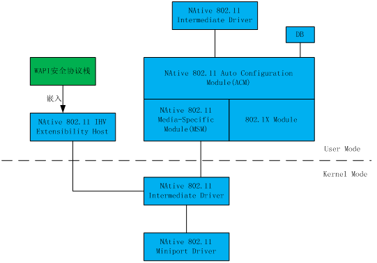 該協(xié)議;赪indows系統(tǒng)的IHV架構(gòu)進(jìn)行設(shè)計(jì)和開發(fā),對系統(tǒng)的網(wǎng)絡(luò)安全進(jìn)行擴(kuò)展,從而實(shí)現(xiàn)對WAPI協(xié)議的處理,并同時(shí)兼容原系統(tǒng)中的其他網(wǎng)絡(luò)協(xié)議棧。協(xié)議棧提供API接口,可使各廠商對WAPI產(chǎn)品進(jìn)行二次開發(fā),而無需關(guān)心WAPI協(xié)議細(xì)節(jié),從而縮短了產(chǎn)品開發(fā)的周期,節(jié)約了產(chǎn)品開發(fā)成本,并保證了不同廠家不同產(chǎn)品之間的互通性和兼容性,為WAPI產(chǎn)品的快速實(shí)現(xiàn)提供了基礎(chǔ)。