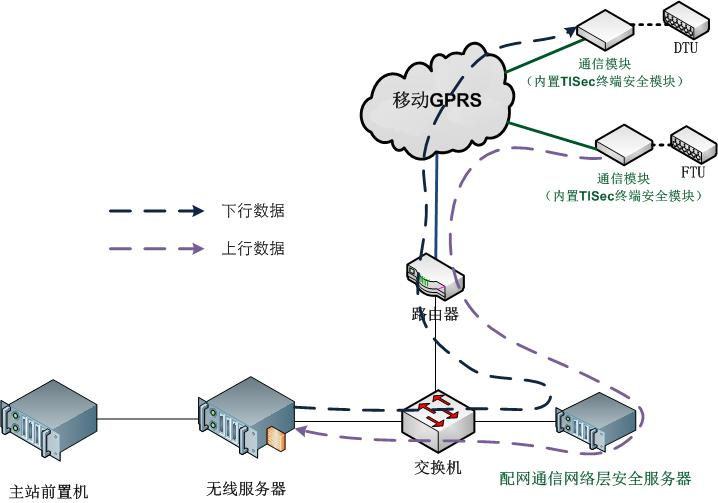 采用TISec系統(tǒng)對通信模塊從網絡層進行必要的加固,不但能夠全面提升其應對網絡攻擊的能力,使其安全強度與DTU/FTU等業(yè)務設備具備相同的安全強度,而且不會對原系統(tǒng)包括應用層安全加固造成任何的影響,達到了增加防御縱深的目的,從而達到全面提升整體系統(tǒng)的安全健壯性的目標,滿足配網系統(tǒng)網絡層安全傳輸的應用需求。附圖為TISec系統(tǒng)在配網通信網絡層的部署拓撲。