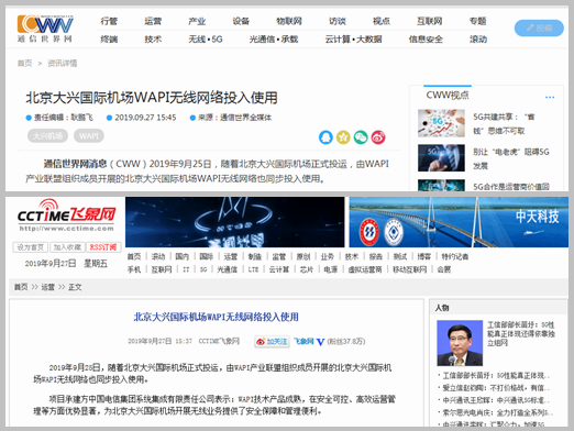 2019年9月25日,隨著北京大興國際機(jī)場正式投運(yùn),由WAPI產(chǎn)業(yè)聯(lián)盟組織成員開展的北京大興國際機(jī)場WAPI無線網(wǎng)絡(luò)也同步投入使用。以下是通信世界網(wǎng)等媒體的報(bào)道: